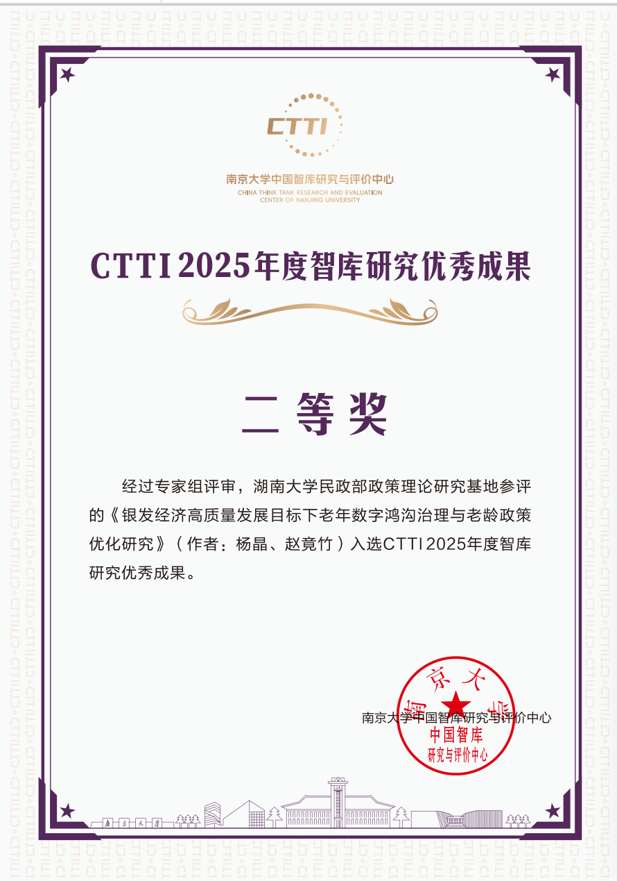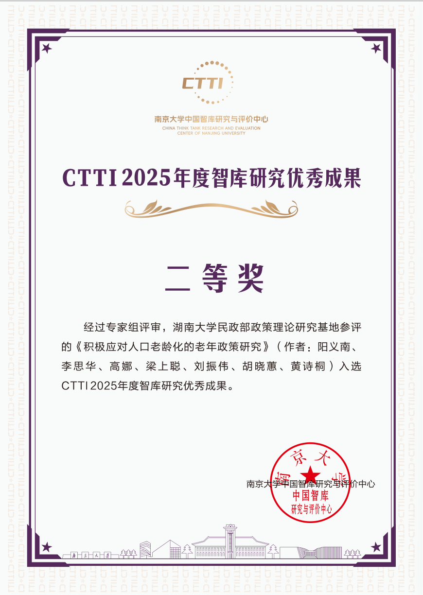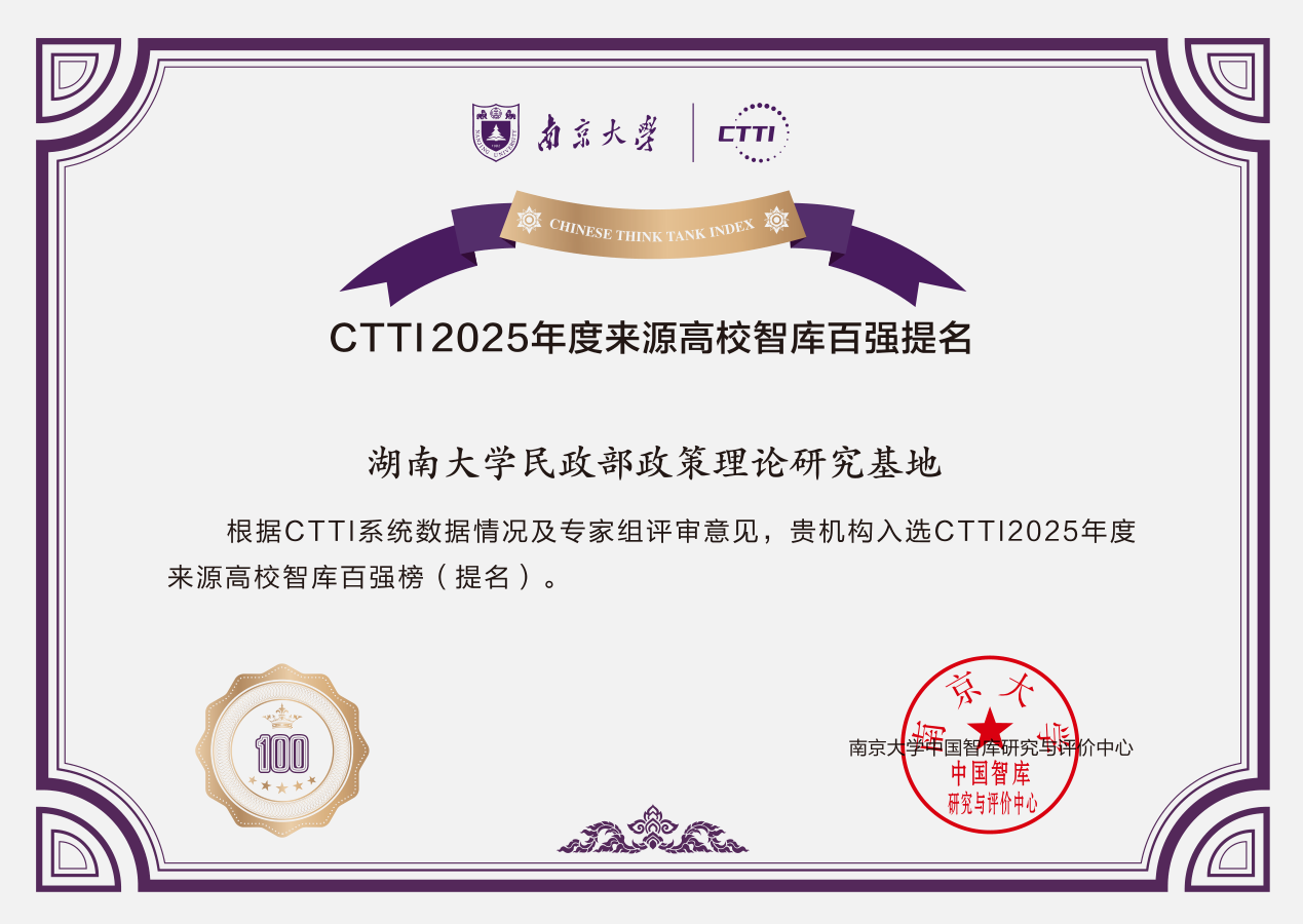 “湖南大学民政部政策理论研究基地”提交的二项成果,获评“CTTI2025年度智库研究优秀成果”二等奖。