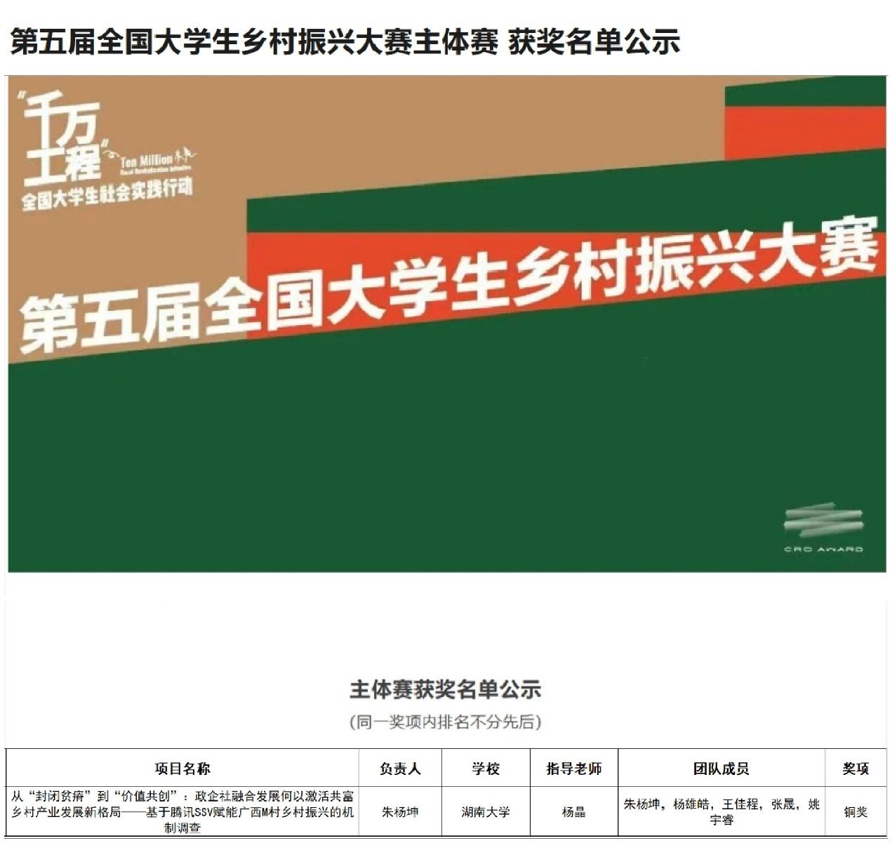杨晶副教授带队指导,本科生朱杨坤、杨雄皓、王佳程、张晟、姚宇睿提交的案例作品《从“封闭贫瘠”到“价值共创”:政企社融合发展何以激活共富乡村产业发展新格局》,历经多轮评审,最终荣获第五届全国大学生乡村振兴大赛主体赛铜奖。