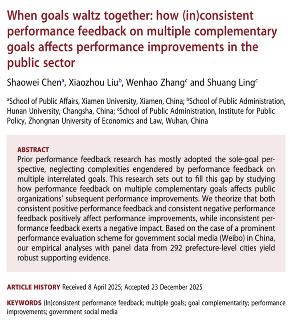 硕士生章文浩、凌双副教授合作的论文“When goals waltz together: how (in)consistent performance feedback on multiple complementary goals affects performance improvements in the public sector”(《当目标共舞:多重互补目标的绩效反馈(不)一致性如何影响公共部门的绩效改进》)于国际权威期刊Public Management Review在线发表。该刊是国际公共管理研究学会(IRSPM)的旗舰期刊,影响因子为4.9,在90本公共管理类国际期刊中位列第五,在政治学、公共政策与公共管理领域享有崇高声誉。