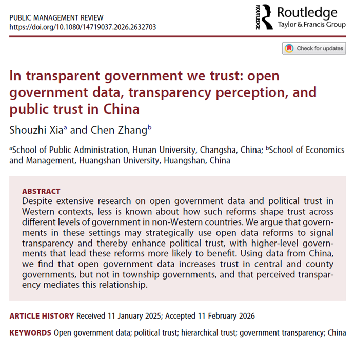 张琛老师合作完成的论文“In transparent government we trust: open government data, transparency perception, and public trust in China”(《我们信赖透明政府:开放政府数据、透明度感知与公众信任》)在公共管理权威期刊《Public Management Review》在线发表。该刊是国际公共管理研究学会(IRSPM)的旗舰期刊,在公共管理与公共政策领域享有较高影响力。