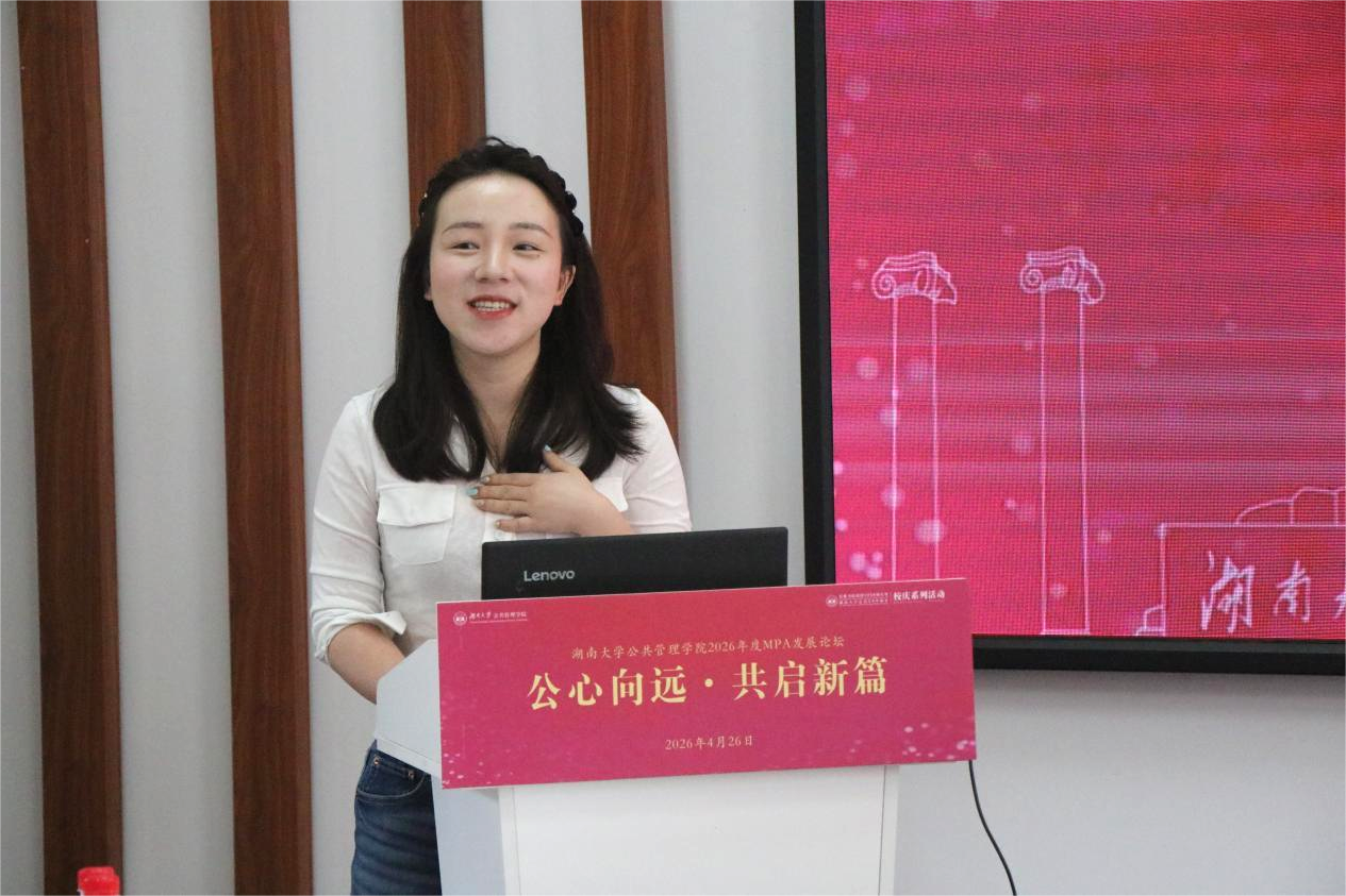 2025级MPA学生代表黄雨晴以《楚材蔚起,公心砺行:以青春之力共筑发展新高峰》为题,结合自身学习经历,呼吁公管学子以奋斗之姿投身时代伟业。